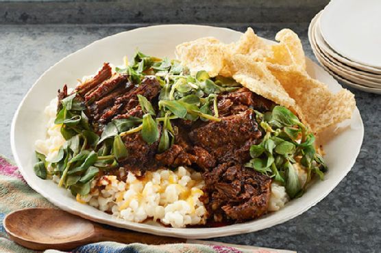 Pork & Green Salsa with Cheesy Hominy