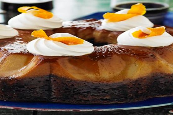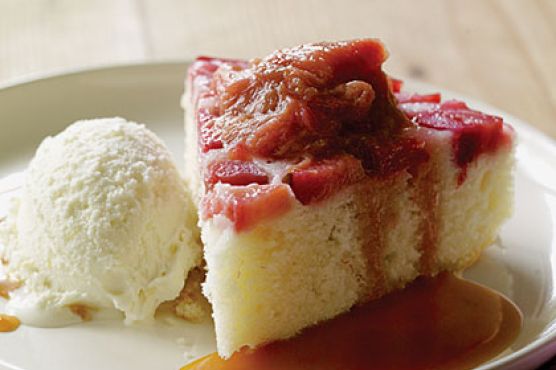 Rhubarb Upside-Down Cake with Rosemary Caramel Sauce