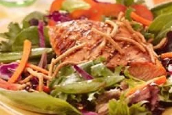 Grilled Salmon, Snap Peas and Spring Mix Salad with Chow Mein Noodles