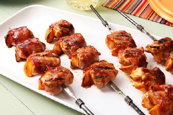 Barbecue Chicken and Peach Kabobs with Bacon