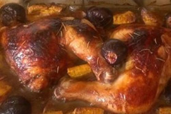 Roast Chicken with Fig, Plantain, and Red Onion
