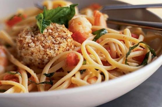 Shrimp, Tomato, and Basil Linguine with Warm Goat Cheese Rounds