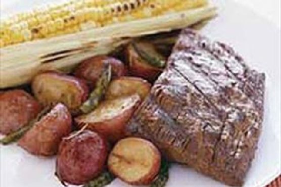Barbecued Flank Steak with Roasted Vegetables and Corn