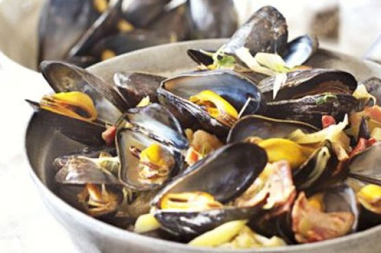 Steamed mussels with leeks, thyme & bacon