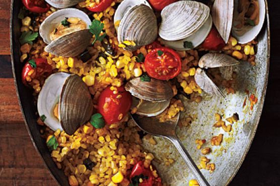 Paella with Poblanos, Corn, and Clams
